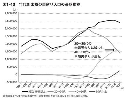 同じ男余りといっても、かつては「若い未婚男余り」だったのに対して、今や「未婚おじさん余り」になったということです。